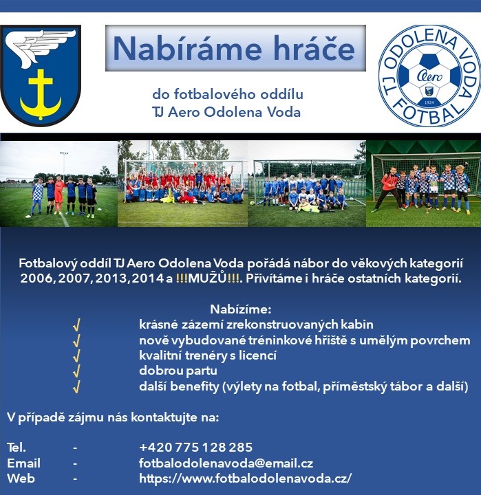 Fotbalový oddíl TJ Aero Odolena Voda, z.s. pořádá průběžný nábor hráčů do vybraných kategorií. Bližší informace viz leták, nebo sekretář oddílu. Dotazy můžete směřovat na email v kontaktech klubu.